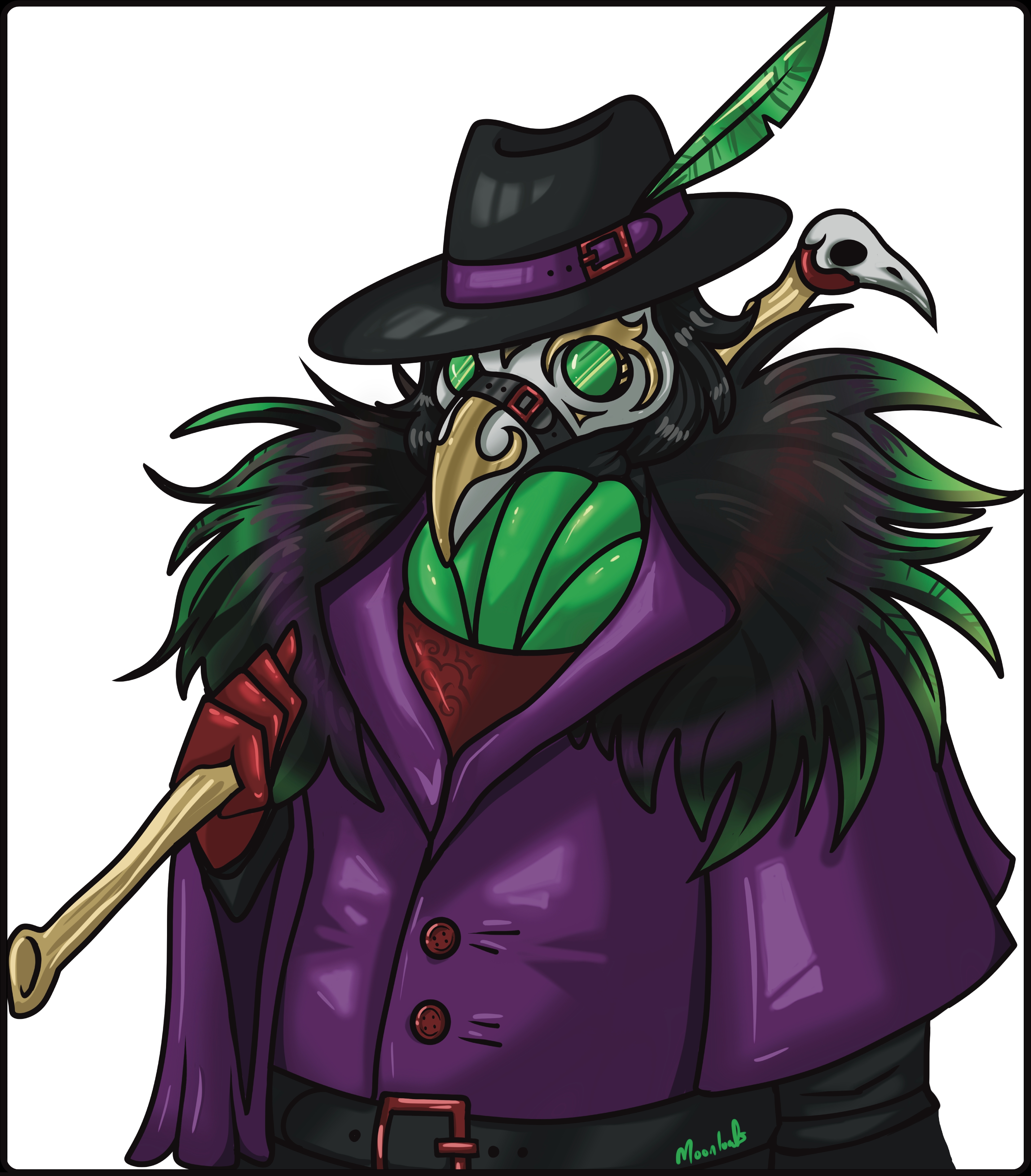 Clothes: classic plague doctor attire. Leather jacket, hat, mask, cane. Clothes are flashy and well taken care of. Cane and mask contain engravings. Fully clothed.